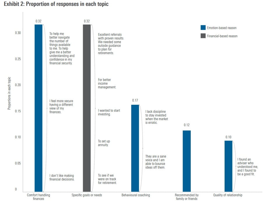 Complessivamente, il 60% delle motivazioni citate nelle risposte analizzate riguarda il supporto emotivo e non bisogni finanziari specifici. Come sottolineato dalle stesse autrici, precedenti ricerche condotte da Vanguard avevano messo in luce come uno degli svantaggi del modello di robo-advisor fosse proprio attribuito al minor supporto emotivo percepito dai suoi utilizzatori.