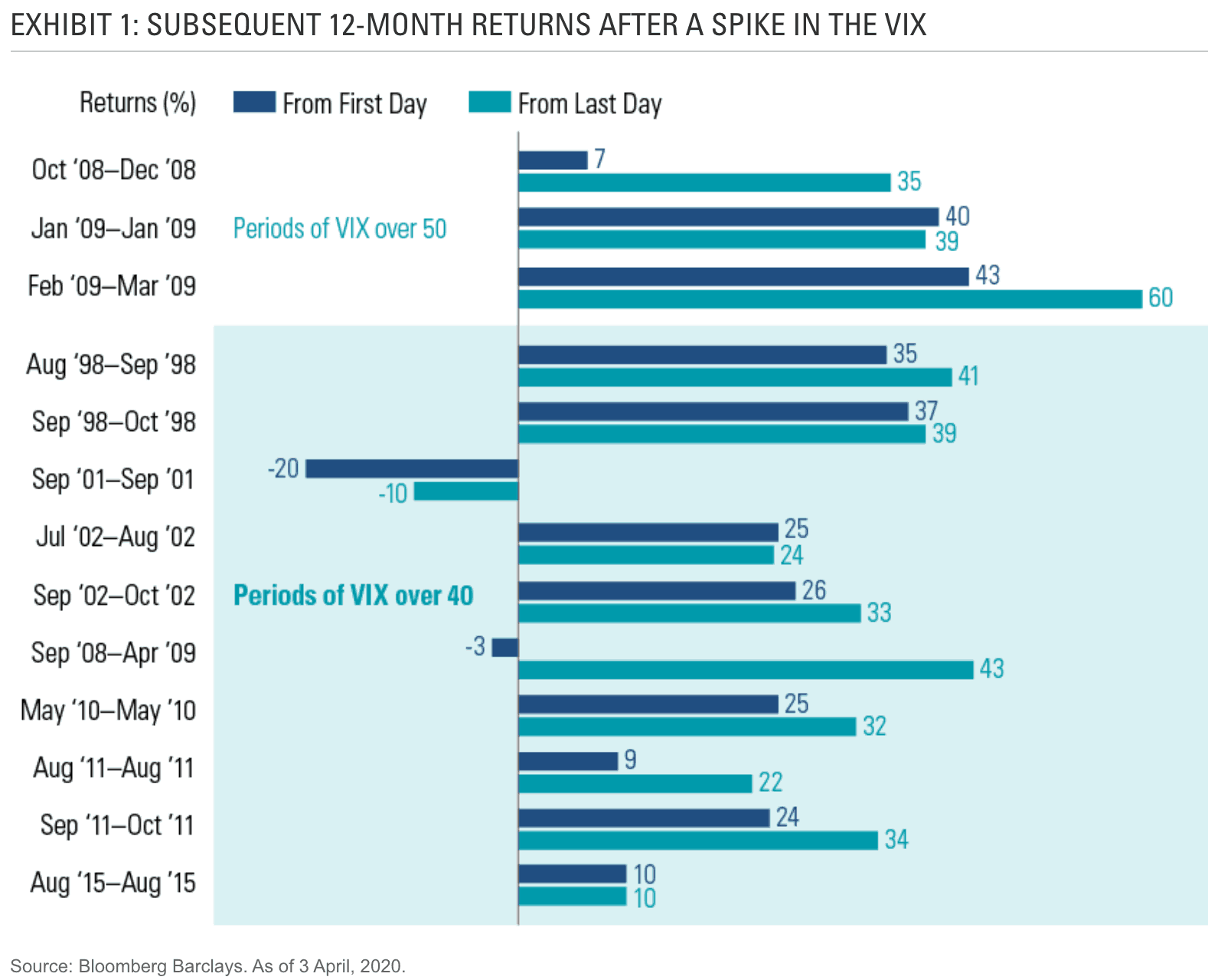 “Nel corso degli ultimi trent’anni ci sono state 10 occasioni in cui il VIX ha infranto la barriera dei 40. In tutti questi periodi tranne due (gli attacchi alle Torri Gemelle dell’11 settembre e la crisi finanziaria globale), i rendimenti azionari sono stati performanti 12 mesi dopo il giorno in cui il VIX ha superato i 40. Se calcoliamo i rendimenti sui 12 mesi a partire dal giorno in cui il VIX è tornato al di sotto dei 40, i risultati sono positivi nove volte su dieci”.