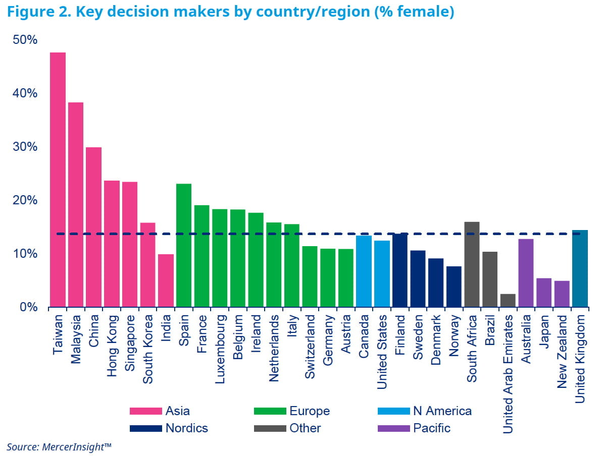 L’analisi geografica mostra infatti come nei 30 paesi analizzati (Taiwan, Malesia, Cina, Hong Kong, Singapore, Corea del Sud, India, Spagna, Francia, Lussemburgo, Belgio, Irlanda, Olanda, Italia, Svizzera, Austria, Canada, Stati Uniti, Finlandia, Svezia, Danimarca, Norvegia, Sud Africa, Brasile, Emirati Arabi Uniti, Australia, Giappone, Nuova Zelanda e Gran Bretagna) la percentuale di figure decisionali al femminile sia aumentata in 22 casi ma diminuita in sette, tra cui proprio l’Italia. Se il Belpaese annoverava al 2019 il 20,3% di donne key decision maker, come mostrano i dati estrapolati da Mercer per We Wealth, nel 2022 se ne calcola solo il 17,2%.