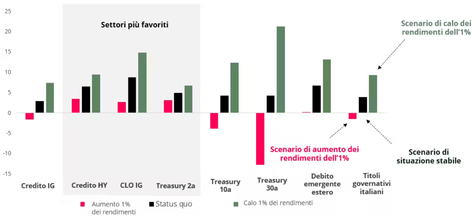 Rendimenti attesi a 1 anno di vari segmenti obbligazionari in base a scenari diversi (in %)