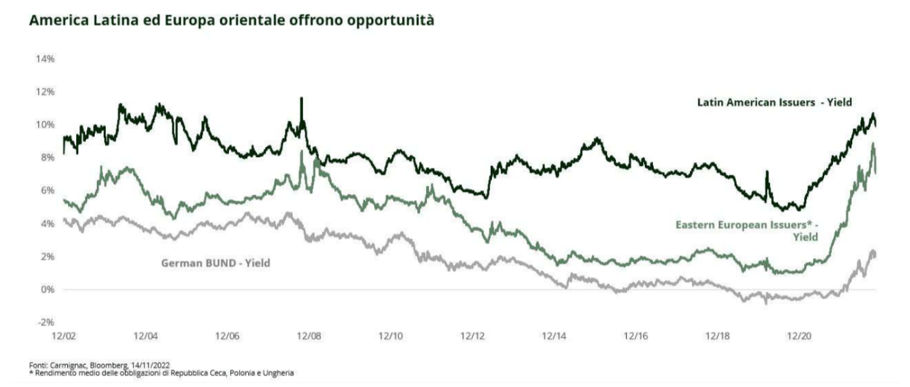 Per gli esperti di Carmignac, l’America Latina e l’Europa Orientale offrono opportunità di rendimento interessanti sia perché tra i primi paesi candidati a interrompere i rialzi dei tassi di interesse a seguito dell’andamento dell’inflazione sia per i benefici da fenomeni di rilocalizzazione delle catene di produzione più vicine ai loro territori