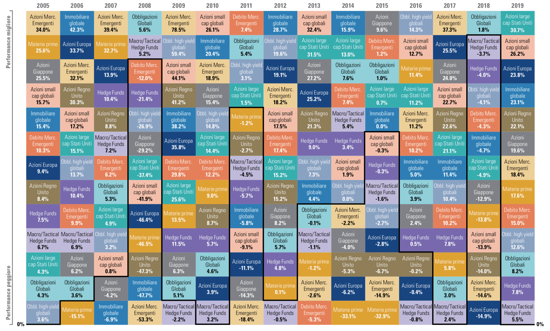 Fanalino di coda (per modo di dire) per debito emergente, obbligazionario high yield e obbligazioni globali, che hanno chiuso il 2019 con performance del 15%, 12,6% e 8,2%, appena sopra hedge e micro hedge funds (+7,8% e +5,5%).