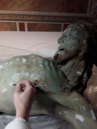 gli Arazzi con episodi della guerra di Troia (o effetti dell’Ira, o della Collera) del Museo dell’Università di Bologna; la meravigliosa Pala detta di San Domenico di Romanino dalla Pinacoteca Tosio-Martinengo di Brescia; il baldacchino con la Vergine e il Bambino da Predazzo; le Croci processionali dal Museo dell’arte Sacra della Marsica a Celano; i dipinti di Santa Cecilia e Santa Apollonia, letteralmente ritornati all’antico splendore dopo un’avventura rocambolesca, da Tolve;