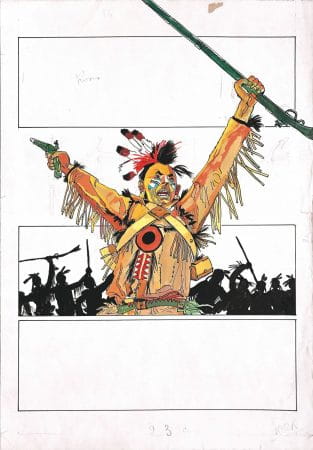 Originale di copertina per il n. 24 della rivista “Sgt. Kirk” edita da Ivaldi Editore nel giugno 1969. Ancora visibile il segno di matita dello schizzo preparatorio di Pratt. Piccoli strappi marginali e lievissime abrasioni marginali, ma opera in eccellente stato.