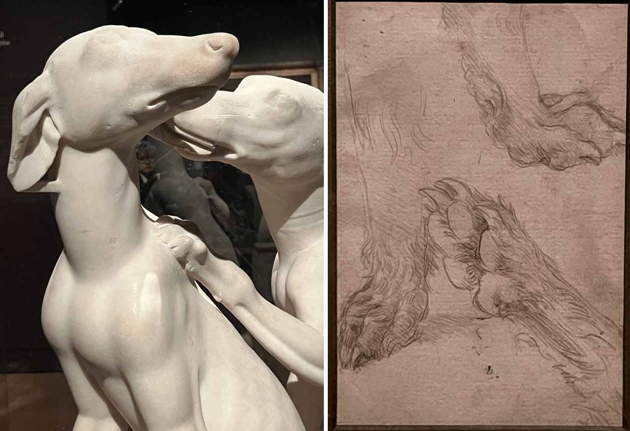 Arte romana del I-II secolo dC, Due levrieri; Leonardo da Vinci, Studi di zampe di cane, 1490-5