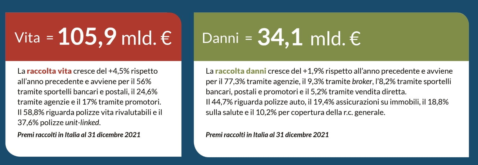 Nel 2021 la crescita dei premi assicurativi è stata più sostanziosa per il ramo vita, che ha visto un incremeno annuo del 4,5% prodotto per oltre la metà dagli sportelli bancari e postali, per il 24,6% tramite agenzie e il 17% dai promotori. Le polizze unit-linked, che non prevedono un capitale garantito e rendimento programmato hanno guadagnato ulteriore terreno sulle polizze vita rivalutabili tradizionali: rispettivamente, si spartiscono i premi del ramo vita al 37,6 e al 58,8%, per un totale di 105,9 miliardi.