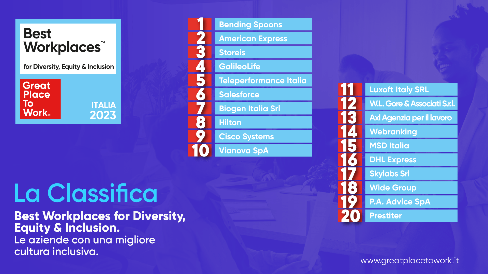 Bending Spoons, American Express e Storeis sul podio delle aziende più inclusive in Italia, secondo la nuova classifica di Great place to work. Discriminazioni al bando (non solo di genere). Favorite meritocrazia nelle promozioni e work-life balance