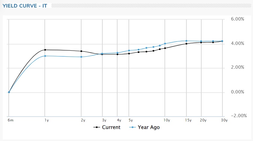 Per i titoli di Stato italiani (Btp) il punto di partenza, nonostante la prospettiva di tagli ai tassi Bce nel corso dell’estate, appare molto diverso rispetto a quello dei Treasuries. La curva dei rendimenti appare molto più piatta.