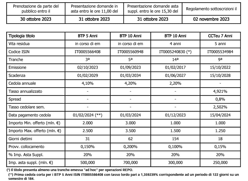 Per prenotarsi a questa emissione primaria, presso l’home banking abilitato al trading o gli sportelli bancari e postali, c’è tempo fino al 30 ottobre. Il Tesoro, al netto dell’asta supplementare, raccoglierà fino a 8,750 miliardi di euro.