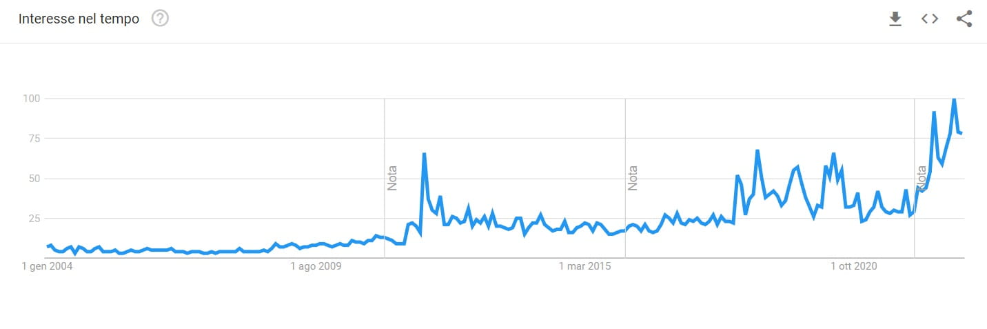 Un termometro, più generale dell’interesse degli investitori al dettaglio sul caro vecchio Btp, da sempre protagonista nei portafogli degli italiani, arriva dalle ricerche rilevate da Google. Dal 2004 a oggi il termine “Btp” non era mai stato tanto cercato sul web come nel novembre 2022, tanto in Italia quanto a livello globale, con un livello che si mantiene, a gennaio 2023, storicamente vicino ai massimi.