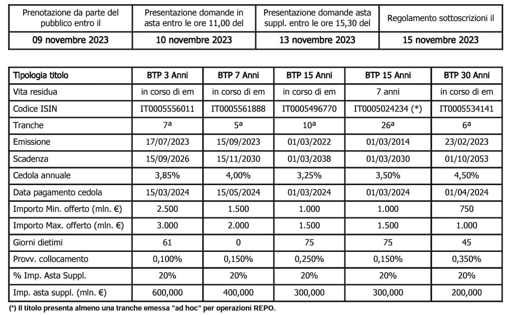 Il ministero dell’Economia si prepara a raccogliere fino a 9 miliardi di euro con la nuova emissione di Btp, con scadenze comprese fra i 3 e i 30 anni. Per prenotare i titoli di Stato che saranno proposti al mercato venerdì, c’è tempo fino al 9 novembre: sarà possibile farlo presso il proprio home banking abilitato al trading, oppure presso gli sportelli bancari e postali.