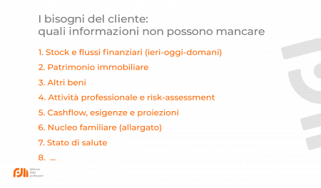 Quindi, cosi? per l’azienda cosi? per il consulente, si dovranno tenere insieme tanto le variabili che influenzano i servizi quanto quelle che originano e alimentano la domanda: il cliente e? una pluralita? da considerare come un unicum, che vive di patrimoni finanziari e immobiliari ma anche di attivita? e rischi professionali, di nuclei familiari, di esigenze, dinamiche e cosi? via. Occorre investigare tutto cio? di cui e per cui il cliente vive. Continuamente.