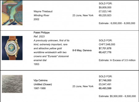 Le vendite private sono aumentate del 107%, così come quelle delle aste in Asia. Le aste di orologi hanno registrato il tutto esaurito ovunque, mentre la società inaugurava il suo nuovo quartier generale nel cuore newyorkese di Park Avenue, in concomitanza del lancio del suo servizio proprietario di art advisory.