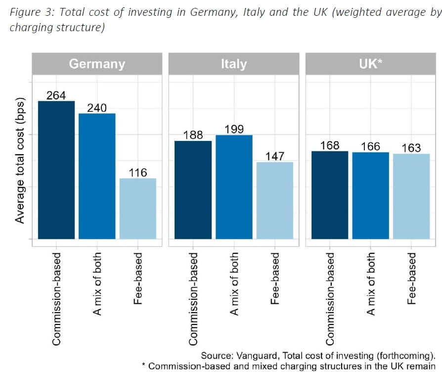 Il position paper comprende le evidenze di un nuovo studio realizzato dal colosso degli Etf, Vanguard, consultato in anteprima dalla stessa federazione. Da questo rapporto emerge come nel Regno Unito, uno dei due Paesi europei che obbliga i consulenti finanziari a farsi pagare solo tramite parcelle, direttamente dalla mano del cliente, i costi complessivi degli investimenti siano più bassi di quelli italiani e di quelli tedeschi. Ciò significa che, nelle stesse condizioni di mercato, i britannici guadagnano più degli italiani, perché a conti fatti investire gli costa meno (il costo si sottrae alle performance).