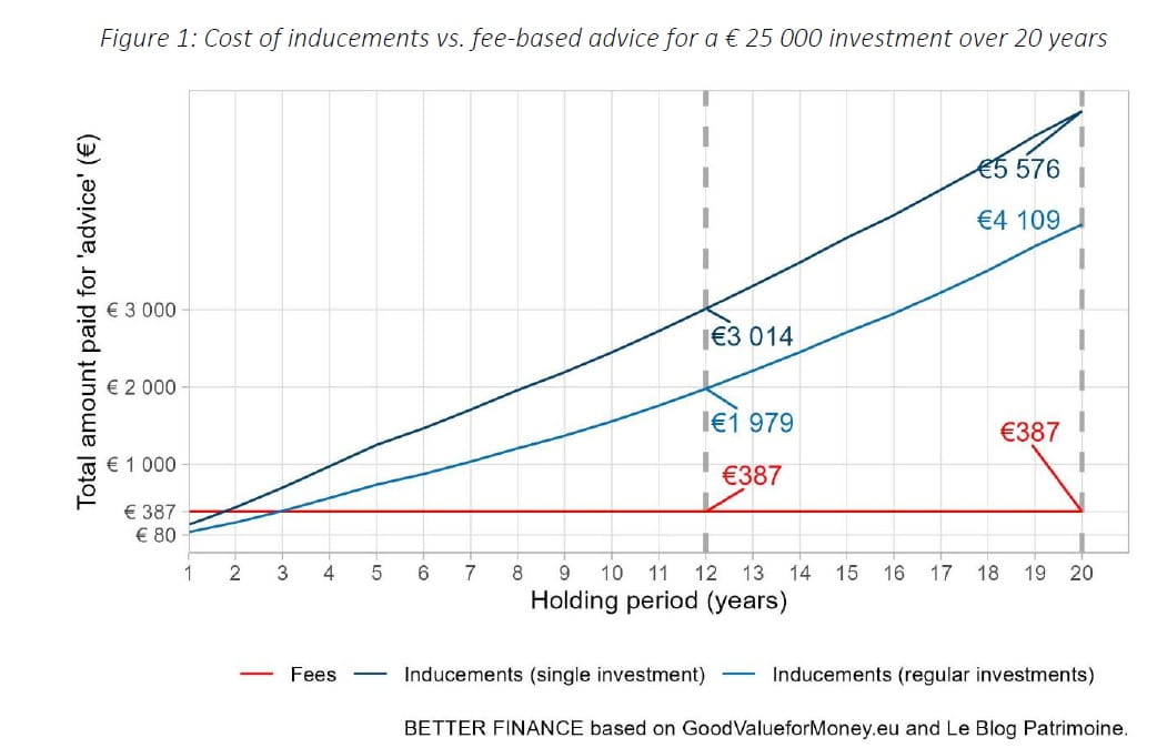 Better Finance ha risposto a questa critica ricordando come il costo “retrocesso”, integrato in una polizza vita, potesse diventare facilmente superiore a quello della parcella. La simulazione si basa sul costo medio degli incentivi percepiti sulle polizze vita in Francia, che ammontano allo 0,8% annuo. Questa percentuale, che copre il costo della consulenza ricevuta, equivarrebbe a un prelievo del 10% in 12 anni, la durata media dei contratti vita.