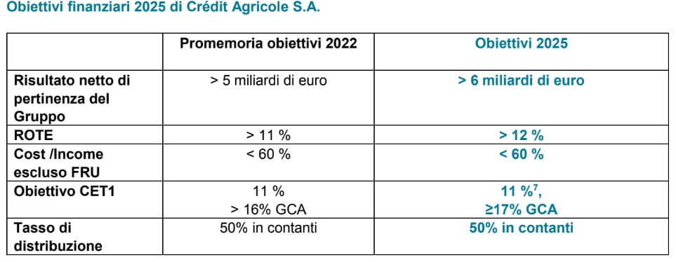 C’è anche il potenziamento del wealth management e della bancassurance nei piani per l’Italia di Credit Agricole. Il gruppo francese, che ha presentato oggi la sua agenda strategica per il 2025, conta di incrementare il ritmo di crescita degli utili rispetto al precedente piano a medio termine, portandoli al +3% annuo medio fra il 2021 e il 2025. I ricavi, nello stesso periodo, dovrebbero aumentare del 3,5% annuo, grazie alla crescita “in tutte le linee di business”. Sul fronte della solidità patrimoniale l’obiettivo del gruppo è di raggiungere un Cet1 pari almeno al 17% entro il 2025, un livello molto al di sopra dei requisiti minimi di vigilanza. L’assemblea degli azionisti, infine, sarà chiamata ad approvare un pagamento aggiuntivo da 20 centesimi per azione per il 2023, rispetto al dividendo che nel 2019 non è stato distribuito. L’obiettivo è di pagare i dividendi in cash al 50%.