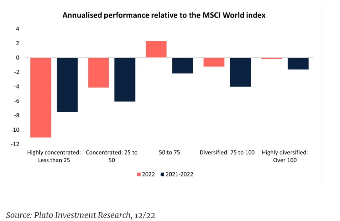 Nella fascia dei fondi azionari iperconcentrati, con meno di 25 azioni in portafoglio, la performance relativa rispetto al Msci World, è stata peggiore di 11,1 punti nel 2022 e del 7,5% nella media di 2021 e 2022. Per i fondi che hanno fra i 25 e 50 titoli in portafoglio la sottoperformance è stata notevolmente più bassa nel 2022, mentre nella media del 2021-22 è rimasta sostanzialmente invariata.