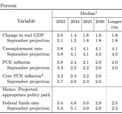 La Federal Reserve ha lasciato invariati i tassi, ma questo esito era già scritto nelle aspettative di tutti gli economisti: l’elemento cruciale della riunione del Fomc lo hanno offerto le nuove proiezioni macroeconomiche, che sono state riviste in senso miglirativo per l’inflazione del 2024, sia per la componente di fondo sia per quella generale, previste entrambe al 2,4%. Il tasso finale per il 2024 passa da una previsione mediana al 5,1% al 4,6%.