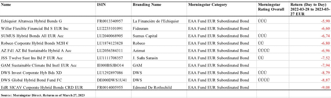 Più in generale, il mercato delle obbligazioni bancarie risulta molto “scontato” rispetto non solo al recente passato, ma anche ai livelli di 12 mesi fa. We Wealth ha chiesto a Morningstar di ordinare i fondi comuni più performanti nell’ultimo anno, fra i molti prodotti specializzati in obbligazioni emesse da istituzioni finanziarie. L’esito rimane decisamente negativo, anche fra i fondi relativamente meno colpiti, con un’influenza determinante del rialzo dei tassi anche su questa tipologia di obbligazioni.