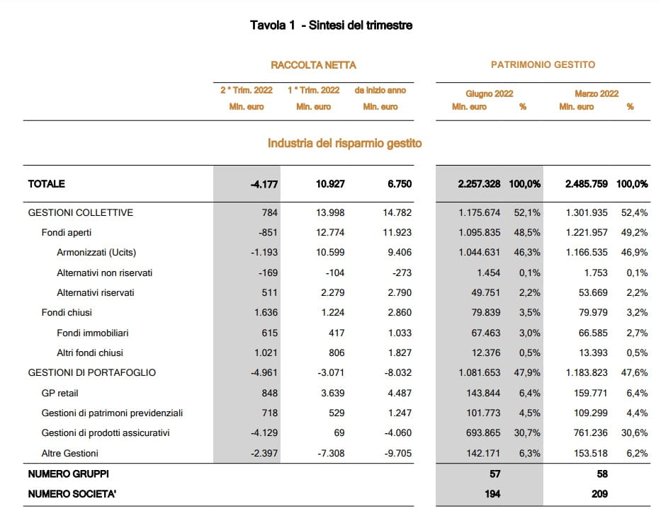 Fra i singoli attori del risparmio gestito, i migliori dati sulla raccolta netta nel secondo trimestre arrivano da Poste Italiane (+1,35 miliardi), Mediolanum (+1,04 miliardi), Arca (734 milioni), Deutsche Bank (616 milioni), M&G (437 milioni), Pictet (407 milioni) e Anima (+386 milioni di euro). In rosso, invece, Intesa Sanpaolo (-4,67 miliardi di euro) e Assicurazioni Generali (-3,91 miliardi), quest’ultima influenzata negativamente dal pagamento del dividendo sui risultati 2021 pari a 1,69 miliardi.