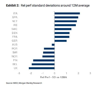 “L’Italia è il Paese più ipercomprato in Europa”, hanno affermato gli analisti di Morgan Stanley, “la recente sovraperformance appare parzialmente giustificata dai fondamentali”, considerando che le valutazioni relative “appaiono poco impegnative”