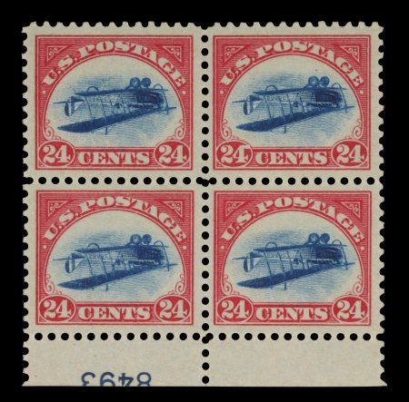 Il Servizio Postale degli Stati Uniti li aveva emessi nel maggio 2018. Bicolore, recano un biplano blu Curtiss JN-4 “Jenny” (il primo vettore postale aereo) sul fronte, circondato da una cornice rossa. Esisteva un solo foglio da 100 francobolli con il biplano stampato a rovescio; quelli andati in asta occupavano le posizioni 87-88-97-98.