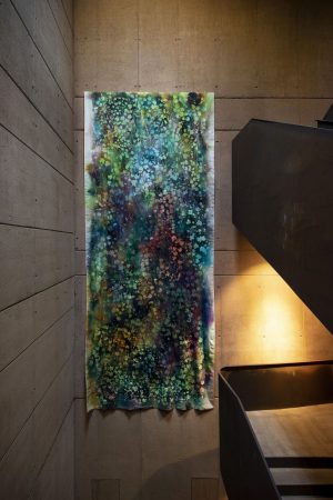 L’opera è stata allestita su una delle scale che portano ai due piani interrati, nel luogo dove il vino nasce, matura e affina. Accompagnando il visitatore dalla collina fino all’interno della cantina ipogea, la tela si trasforma in una sorta di finestra affacciata su un paesaggio immaginario generato dalla mano dell’artista e da quella della natura. Non a caso la curatrice sostiene che “il processo creativo di Sam Falls per queste tele ambientali ha molto in comune con le modalità di produzione del vino in cui il tempo e la pazienza devono unirsi a una conoscenza, a una manualità reagendo e adattandosi sempre alla imprevedibilità del clima e degli accadimenti naturali. E continua, “come il sapere della tradizione vinicola della famiglia, Sam Falls coniuga la conoscenza della tradizione della land art e della pittura astratta con la sua visione contemporanea e la sua conoscenza della storia della fotografia sperimentale.”
