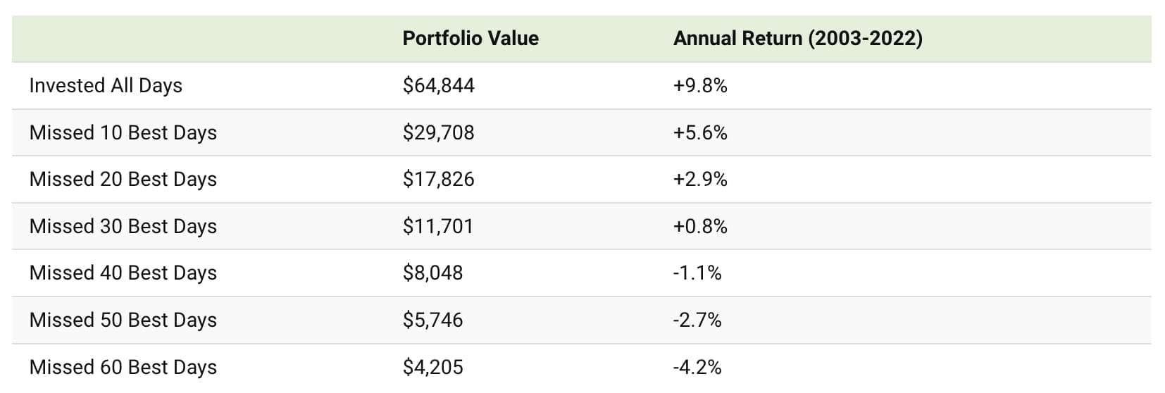 Visual Capitalist ha analizzato 20 anni di dati di Jp Morgan, confrontando i rendimenti totali di un investimento di 10mila dollari nell’S&P 500 tra il 2003 e il 2022