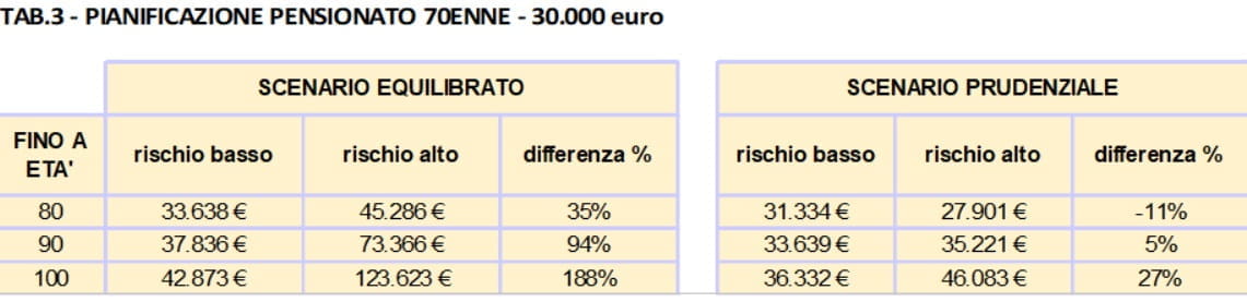 L’ultimo caso simulato è quello di un pensionato 70enne che volesse comprendere gli effetti del profilo di rischio sull’investimento di 30.000 euro una tantum su orizzonti di 10, 20 o 30 anni