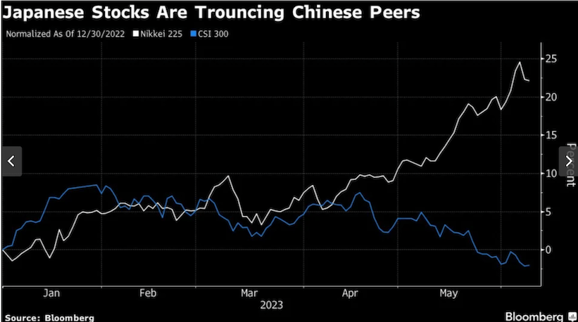 Anche gli investitori retail cinesi fanno buon viso a cattivo gioco puntando con decisione sul Giappone mentre il mercato azionario cinese ha ceduto il passo dopo i fasti di inizio anno. Quello che a detta di molti l’anno era destinato ad essere l’anno della Cina in scia alla riapertura post-covid, ad oggi sta riservando dei risultati contrastanti complice la ripresa economica della Cina più lenta del previsto e le tensioni con gli Stati Uniti che hanno frustrato gli investitori con l’azionario cinese che ha azzerato i guadagni da inizio anno.
