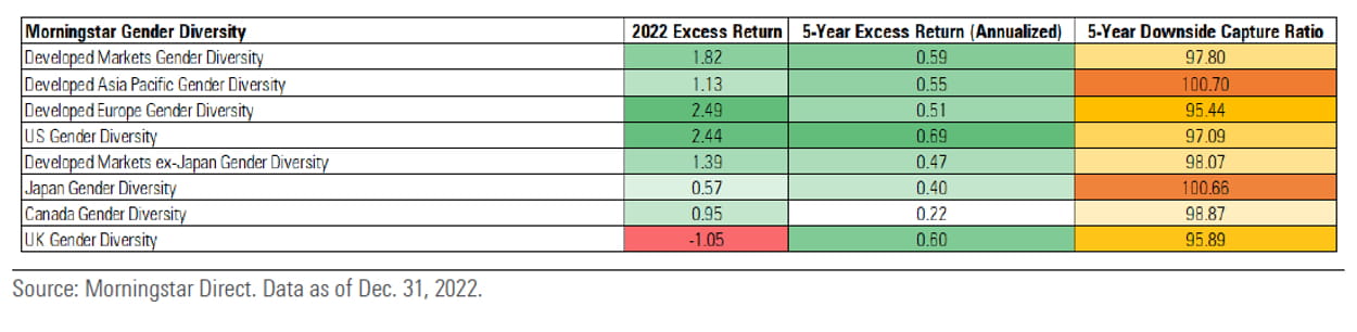 L’indice Morningstar developed europe gender diversity, che include le aziende europee più attente all’equità di genere – secondo una serie di criteri fissati da Equileap tra cui l’equità retributiva e il bilanciamento di uomini e donne nella forza lavoro, nei ruoli dirigenziali e nei consigli di amministrazione – ha avuto un rendimento in eccesso rispetto al corrispondente indice tradizionale di 2,49 punti percentuali. Il paniere globale dei mercati sviluppati ha registrato un excess return nel 2022 dell’1,82% e quello statunitense del 2,44%.