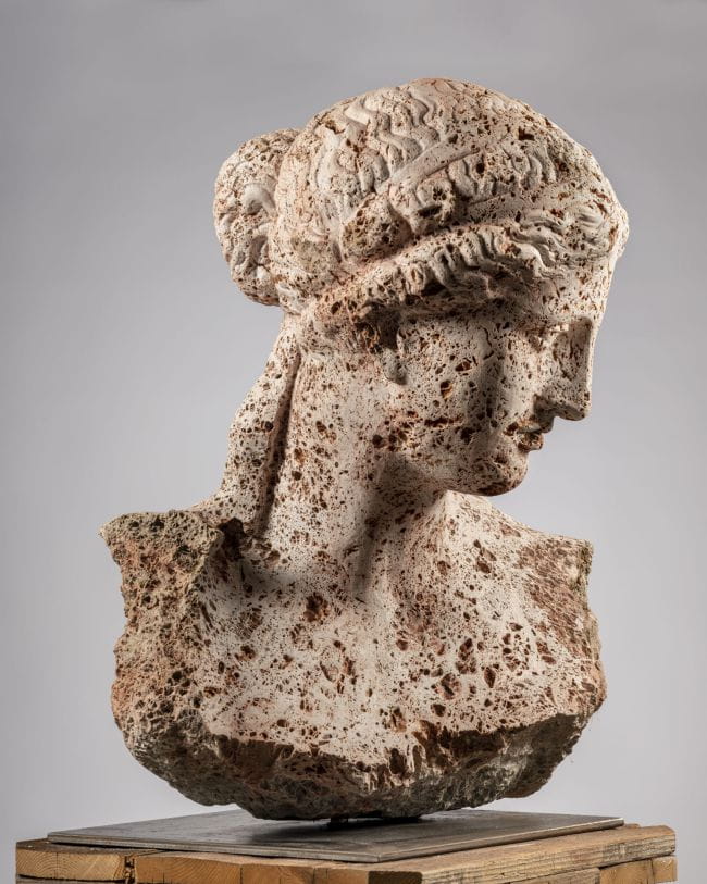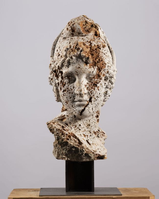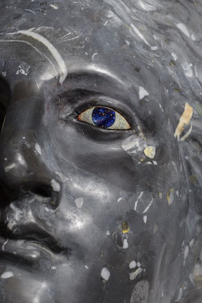 Towards You – esposta in mostra da Ersel – è una testa in marmo iconograficamente classica nella quale Massimiliano Pelletti ha inserito una tecnica inedita per realizzare il colore degli occhi, un micro mosaico in vetro e oro, adottando una metodologia antica e complessa. Sono pochissimi gli artigiani al mondo in grado di elaborarlo, tutti per lo più nell’ambito dei preziosi e delle pietre da gioiello. L’attitudine a sperimentare è un tratto caratteristico di Pelletti, il quale ama avvalersi di numerose tecniche generalmente non associate alla scultura. Lo sguardo dell’artista si riflette quindi nei tagli, negli innesti, nella valorizzazione dei difetti materici, fino alla scelta di accostare elementi che generalmente non vengono usati all’interno della stessa serie.