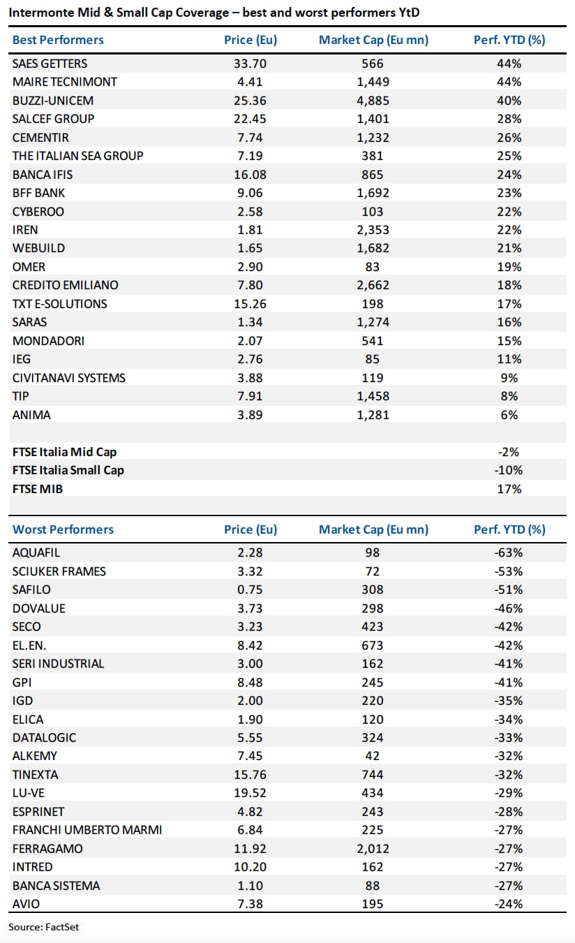 Guardando infine con lo specchietto retrovisore alle 20 migliori performer da inizio anno, 13 hanno battuto il Ftse Mib. Sulla vetta del podio Saes Getters (società produttrice di materiale funzionale avanzato) e Maire Tecnimont (gruppo societario italiano attivo nel settore ingegneristico, tecnologico ed energetico) rispettivamente in rialzo del +44%. Seguono Buzzi-Unicem (+40%), Salcef Group (+28%), Cementir (+26%), The italian sea group (+25%), Banca Ifis (+24%), Bff Bank (+23%), Cyberoo (+22%), Iren (+22%), Webuild (+21%), Omer (+19%) e Credito Emiliano (+18%). Sul versante opposto, a incassare le peggiori performance da gennaio sono Aquafil (-63%), Sciuker Frames (-53%) e Safilo (-51%).