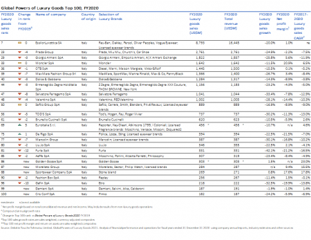 Fra i nuovi ingressi che interessano il nostro paese vi sono Golden Goose (86°), Morellato (87°), Sportswear Company (Stone Island) (88°) e CrisConf (Pinko) (100°). Si segnala anche il rientro in classifica di Damiani, al 99° posto. Golden Goose, Sportswear company e Morellato sono anche tra le aziende a crescita più rapida (rispettivamente al quarto, quinto e ottavo posto, grazie ai tassi di crescita a doppia cifra per il periodo degli anni fiscali 2017-2020: 23%, 17,8% e 15,5%).