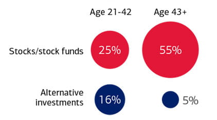 Nella distribuzione di portafoglio media nel segmento “giovane” le azioni occupano un 25% quasi la metà rispetto al 55% degli intervistati over 42. Al contrario, gli asset alternativi rappresentano il 16% dell’allocazione dei Millennial facoltosi, oltre il triplo rispetto agli over 42 che si trovano nelle medesime disponibilità economiche.