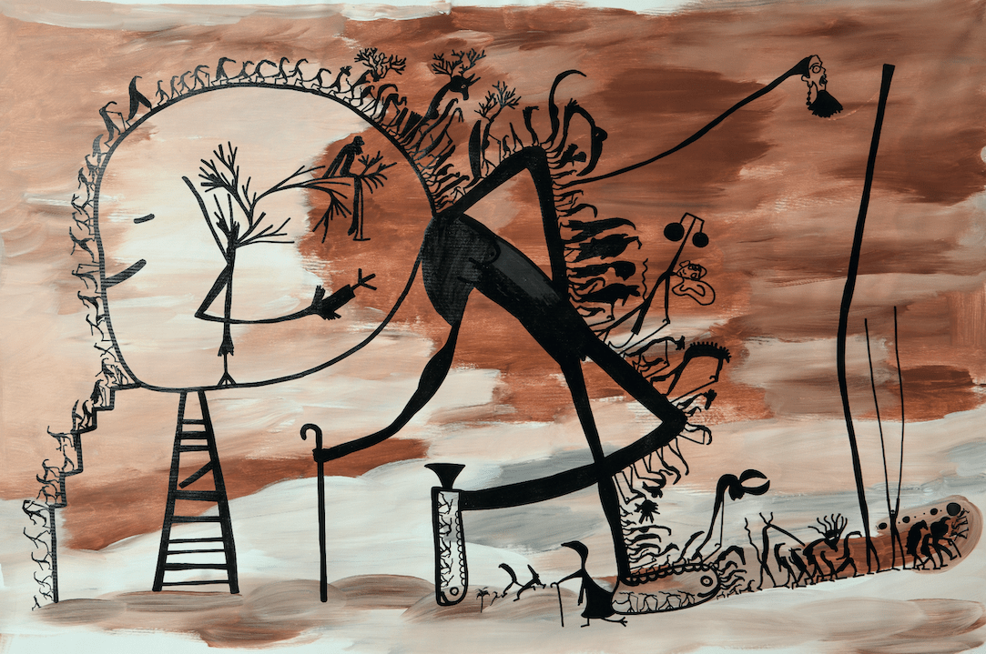 Nei lavori di Mo Baala troviamo una varietà di figure antropomorfe: uomini con la testa di un uccello, senza mani e senza ali; personaggi neri come il colore delle ombre a rappresentare l’assenza e la presenza della sua famiglia. E poi ancora scale, a volte rotte a volte intatte che rappresentano le occasioni e le difficoltà che ci offre la vita. Nei quadri di Mo Baala troviamo inoltre dei dettagli realizzati con la tecnica a spruzzo, a proposito di questo particolare Mo mi ha raccontato un aneddoto che mi ha molto colpita.