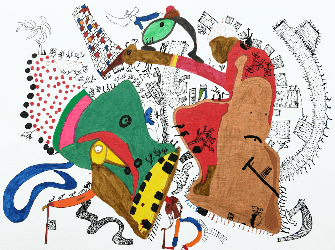 Mo Baala, Immigrants, tecnica mista su tela, 131×209 cm, 2019