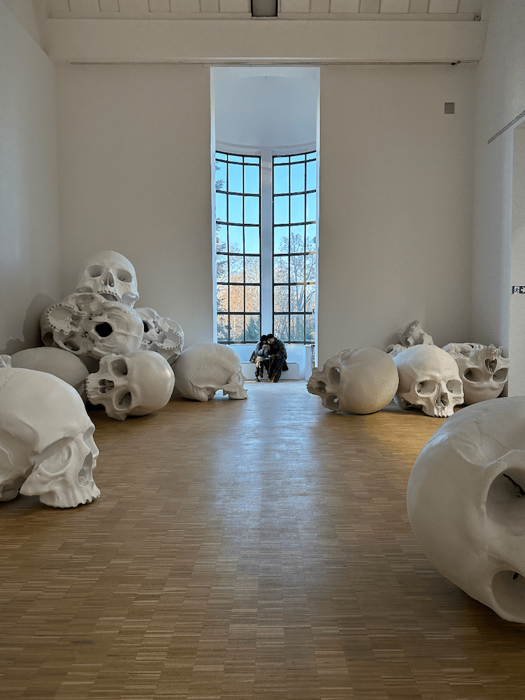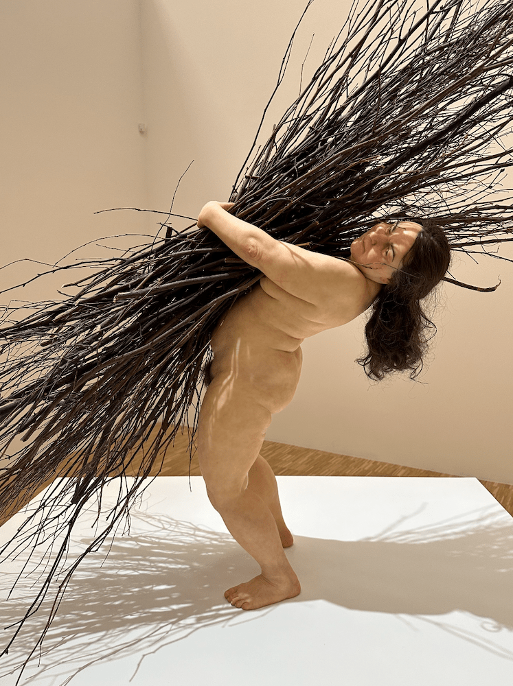 Oggi le opere di Mueck sono esposte in collezioni pubbliche e private in tutto il mondo (tra cui la National Gallery of Victoria a Melbourne, la National Gallery of Canada ad Ottawa, la Tate di Londra e il Museum of Fine Arts di Houston) e l’artista è rappresentato dalla galleria austriaca Thaddaeus Ropac (dopo anni nella scuderia di Anthony D’Offay). Nonostante il successo, però, Ron è rimasto una persona riservata e poco affascinata dal “business dell’arte”. Come ben visibile anche dai due cortometraggi proiettati in Triennale (Still Life: Ron Mueck at Work (2013) e Three Dogs, a Pig and a Crow (2023) di Gautier Deblonde), l’artista è totalmente dedicato – in modo quasi maniacale – alle proprie opere, che compone nel suo studio insieme ad assistenti fidati e di lunga data. Chiari sono i due pilastri fondamentali della sua arte: alterare le misure di ciò che si osserva (Mueck ha dichiarato di non essere interessato a ritrarre le persone con dimensioni reali, perché le vediamo ed incontriamo già tutti i giorni) e cogliere il moto d’animo interno dei propri soggetti (nonostante l’artista passi molto tempo a lavorare sulla superficie). Tante sono le opere di Ron che rispecchiano in modo evidente questa filosofia, come In Bed (2005) (monumentale figura di donna stesa sotto le coperte con lo sguardo straniante perso nel vuoto), Baby (2000) (il ritratto di un neonato di dimensioni minuscole, appeso al muro in posizione simile a quella del crocifisso) e Woman with Sticks (2009) (una donna che regge con fatica un fascio di legna), tutte esposte nelle sale della Triennale. Diverse sono invece le installazioni più recenti (quali i teschi di Mass, 2017, realizzati per la National Gallery of Victoria), che pur richiamando il tema della morte non ci fanno dubitare intensamente dell’oggetto che stiamo osservando (a differenza delle opere “storiche” di Mueck).