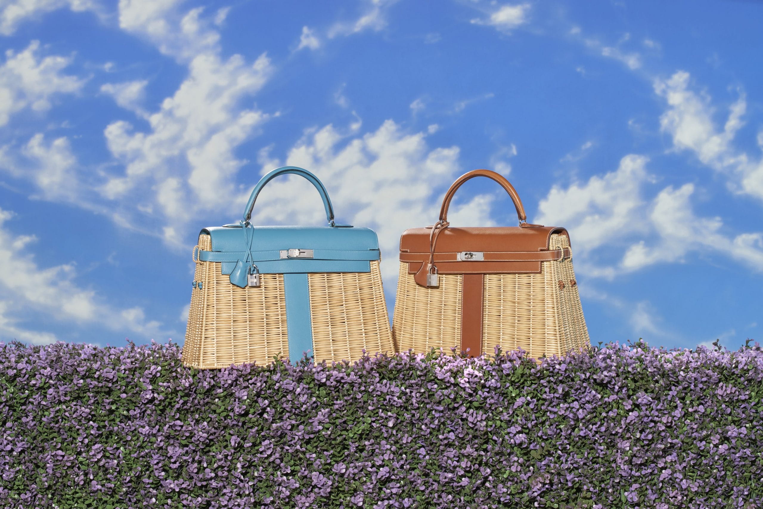 A limited edition turquoise swift leather & osier Picnic Kelly 35 with palladium hardware, Hermès, 2013 and A limited edition natural swift leather & osier Picnic Kelly 35 with palladium hardware, Hermès, 2011. Courtesy: Christie’s.