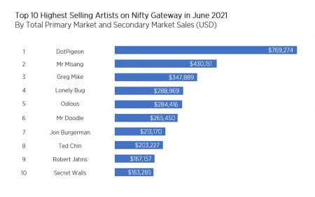 Al numero uno della top ten delle vendite di nft per il mese di giugno 2021 c’è DotPigeon (classe 1987). Con 770.000 dollari, l’artista italiano guida la classifica dei lotti venduti sulla piattaforma leader di quel mercato, Nifty Gateway: