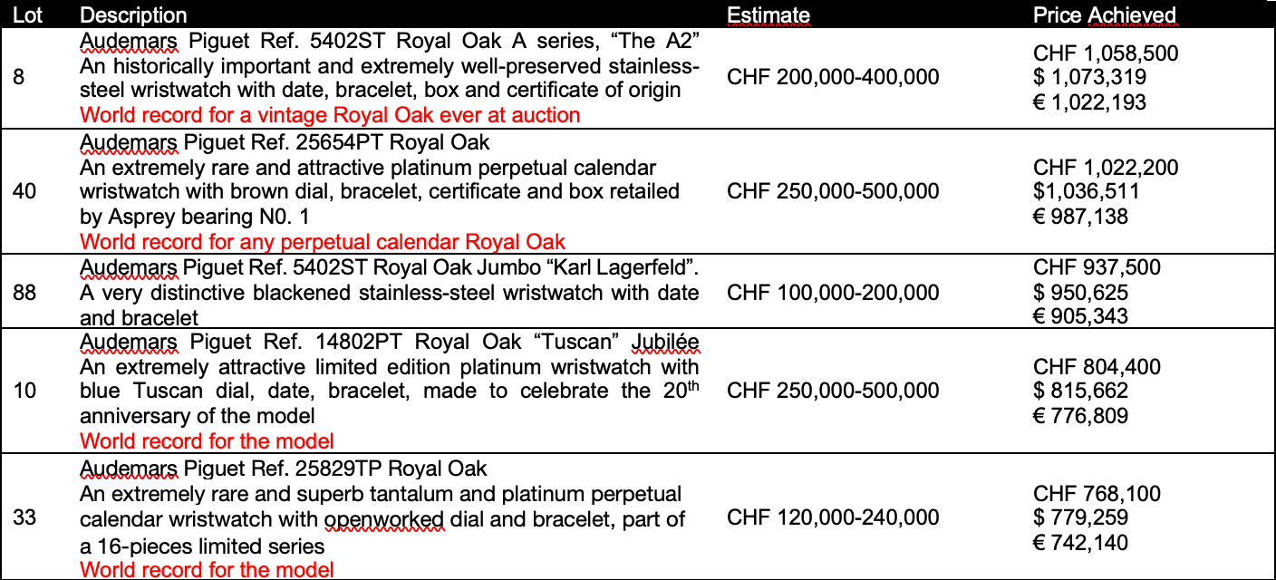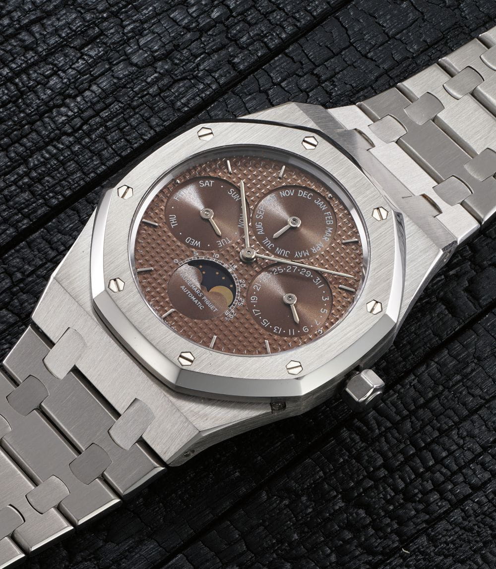 I primi cinque orologi classificati hanno tutti infilato dei record. Al secondo posto, un Royal Oak con calendario perpetuale in platino, referenza 25654PT con quadrante marrone a doppia firma di Asprey, ha incassato 1,03 milioni di dollari, raddoppiando la stima alta di partenza e classificandosi come il più costoso RO con calendario perpetuale della storia.
