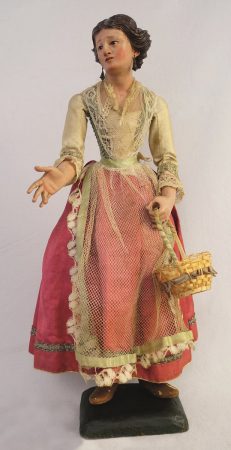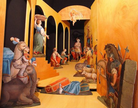 A Genova nel corso del XVII secolo si era sviluppata un’attenzione minuziosa alla rappresentazione scultorea della nascita di Gesù: legni intagliati e policromati, pasta di vetro per gli occhi, pizzi e galloni in argento e oro filato per gli abiti dei personaggi, pietre dure, coralli, filigrane. La cultura genovese dei presepi raggiunge il proprio apice nel XVIII secolo: le statuine genovesi divengono veri oggetti d’arte, spesso uniti ad apparati scenici effimeri. Il Museo Luxoro di Genova ne custodisce oggi alcuni ottimi esempi, e ne ha prestato uno alla mostra, a sagome dipinte su carta, di produzione lombarda settecentesca.