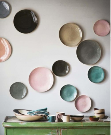 Esempi di decorazioni delle pareti con piatti di ceramiche, decorati con fantasia o tinta unita, di produzione industriale