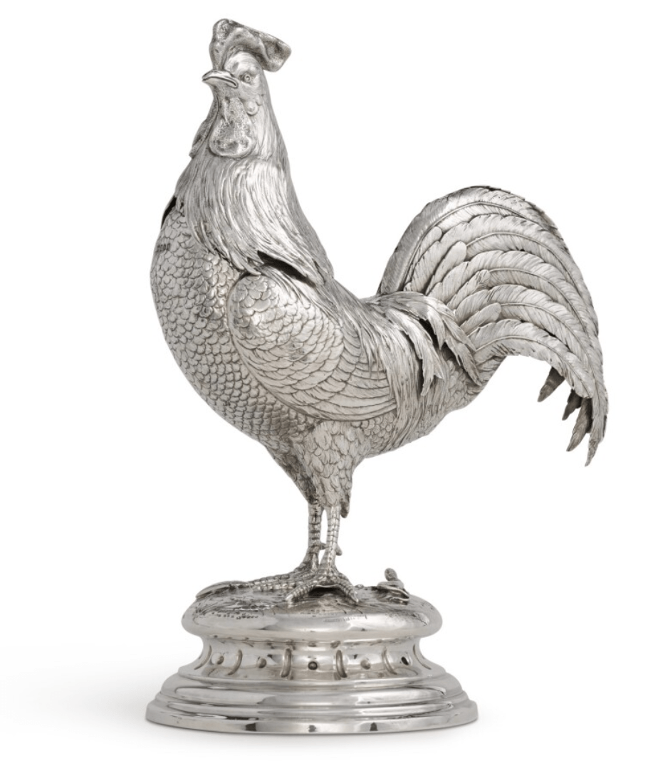 Alta 37 centimetri, la deliziosa scultura si compone di un realistico galletto lavorato finemente per dare risalto alle piume e alle zampe, oltre che alla testa dell’animale. Il galletto sovrasta un piedistallo che riproduce un prato d’erba su cui giace una piccola lucertola. Il marchio sul petto del galletto è quello dell’importatore, J.S Struck, uno dei tre registrati al London assay office il 20 ottobre 1899 dalla John George Smith & Co., società a capo della Continental Daily Parcels Express con sede a Gracechurch Street, a Londra e a Dover, nel Kent.