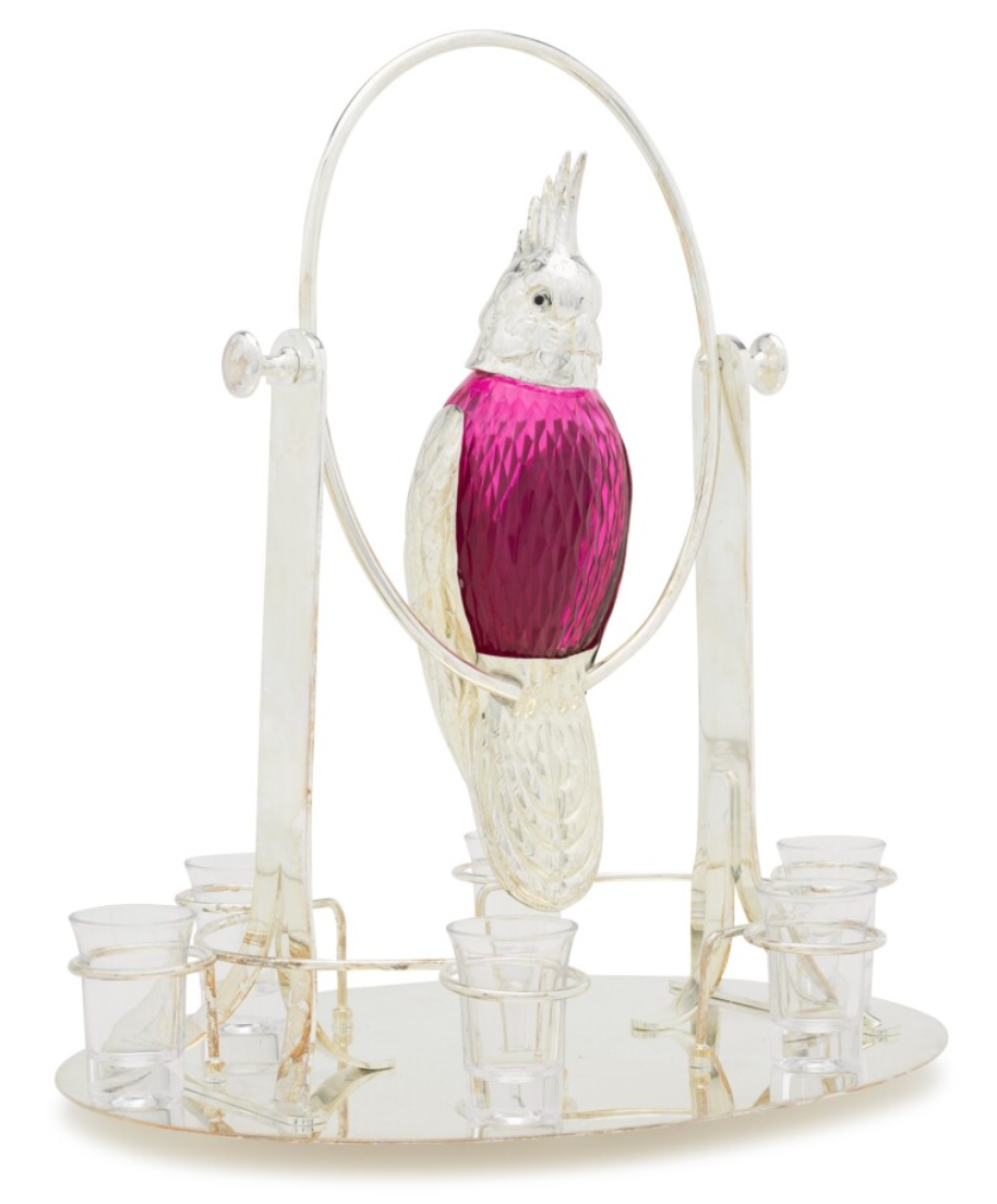 Lotto decisamente originale è questo set per la distribuzione dei liquori, oltre che per l’intrattenimento degli ospiti. La testina dell’uccellino è infatti apribile così da inserire l’alcolico preferito. Attraverso il cerchio girevole il cacatua potrà quindi inclinarsi per versare il liquore nei bicchierini. L’oggetto è stato realizzato nei primi anni del Novecento; l’uccellino e i bicchieri sono in vetro, mentre il resto è in acciaio galvanizzato.
