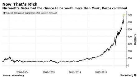 E invece, qual è stato l’errore (dipende sempre dai punti di vista) del fondatore di Microsoft Bill Gates, dopo quello di Musk? Vendere la maggioranza della sua partecipazione nella società prima di lasciarne il consiglio di amministrazione nel 2020. Il grafico di Bloomberg parla chiaro circa l’evoluzione del valore di quelle azioni nel tempo: