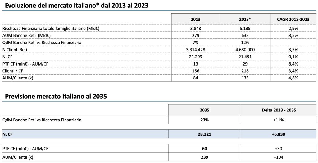 Per elaborare la previsione al 2035, Excellence Consulting ipotizza innanzitutto che i tassi di crescita sperimentati nell’ultimo decennio si confermino. Contemporaneamente, stabilisce un vincolo al numero di clienti che ogni consulente potrà gestire con successo in futuro, ovvero 250. Sulla base di queste ipotesi, la ricchezza finanziaria totale delle famiglie italiane salirebbe a 7.200 miliardi di euro. La quota di mercato delle reti italiane rispetto alla ricchezza finanziaria totale delle famiglie passerebbe a sua volta al 23% (+11%) e il portafoglio medio dei consulenti toccherebbe i 60 milioni di euro pro capite (+30 milioni). Di conseguenza, ci sarà spazio precisamente per 6.830 nuovi consulenti finanziari.