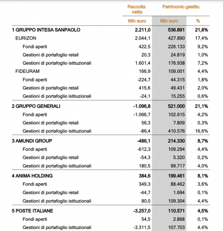Amundi evidenzia un deflusso di 486 milioni, mentre Anima vede aumentare le masse in gestione di 384 milioni. Il quinto gruppo italiano per masse gestite, Poste Italiane, segna invece una contrazione di 3,2 miliardi, dovuti a movimenti nelle gestioni istituzionali di portafoglio.