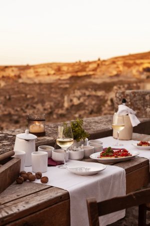 Tutto il complesso – il fondatore non ama usare l’espressione di “albergo diffuso” – è collocato nella parte più antica dei Sassi, la Civita, a strapiombo sul torrente Gravina, dirimpetto all’aspro e fascinoso paesaggio del Parco della Murgia e delle sue chiese rupestri.