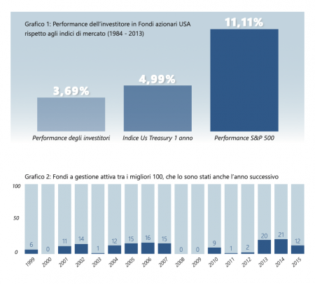 Inoltre 8 Fondi d’investimento su 10 hanno performance peggiori del mercato: i 2 Fondi che si salvano, di solito peggiorano l’anno successivo (grafico 2) e questo conferma che gli strumenti di investimento sono spesso inefficienti per gestire i patrimoni dei clienti, che non avranno mai guadagni correlati all’andamento dei mercati.